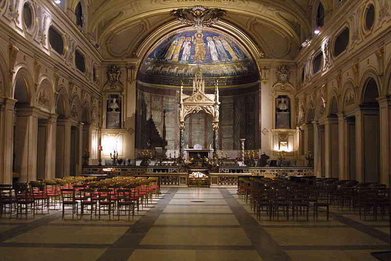 I have fond memories of the basilica of Santa Cecilia in Trastevere. During my time at Rome, a few of us used to go there occasionally for the dignified liturgy and beautiful chant. St Cecilia's is also a treasure of Christian art and architecture. It was founded in the 3rd century and rebuilt by Pope Paschal I in 822. The relics of St Cecilia were moved here and in 1600, Carlo Maderno carved the superb sculpture of the saint, modelled on her body as it was seen at the re-opening of her tomb. You can see the mark of the blade on her neck, and her fingers are arranged to indicate 3 and 1 in affirmation of the doctrine of the Holy Trinity.