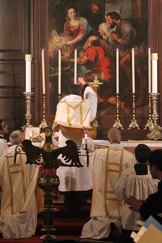 Photograph by James BradleyYesterday evening, the Abbot of Downside, Aidan Bellenger, celebrated Mass in the chapel of Corpus Christi College, Oxford, at the invitation of the Newman Society. As a former President of the Society, and a member of Corpus, I was very disappointed not to be able to take up the invitation to assist at the Mass. It is great to see photos of the chapel with its magnificent altarpiece by Rubens and the rare pre-reformation brass eagle lectern, in the context of the celebration of Mass. The Mass was celebrated in the ordinary form with Haydn's Missa in Angustiis.
