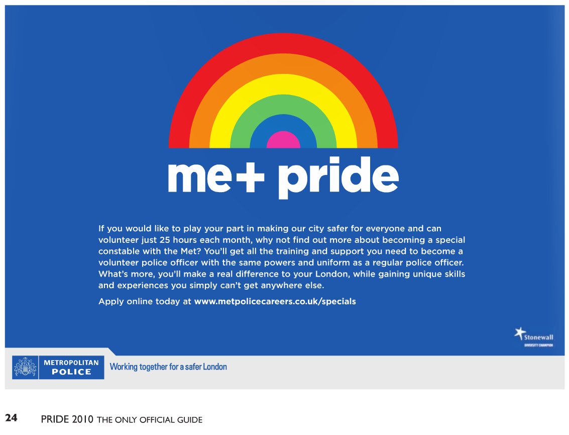 Dylan has posted photos from various Pride events in different countries. I would rather avoid those here. The above graphic was taken from an advert placed in last year's year's Official Guide to Pride London. There are advertisements for fostering and adoption services, and for the Driver and Vehicle Licensing Authority. Here is the one for the Metropolitan Police: